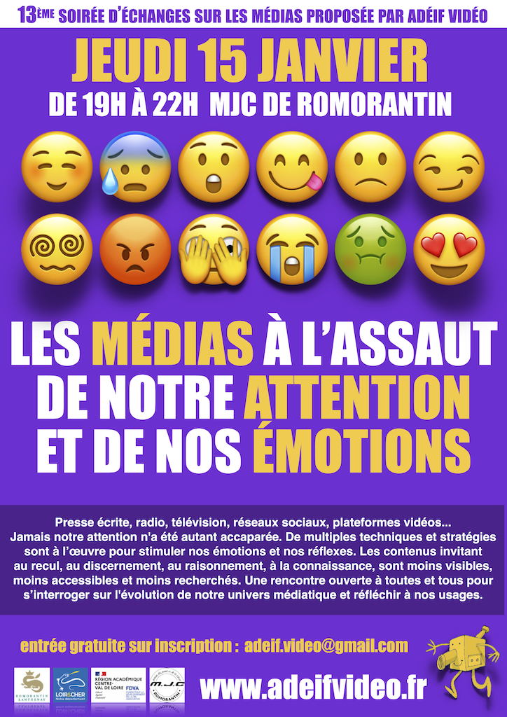 Elle aura lieu le jeudi 15 janvier, de 19h à 22h, à la MJC de Romorantin. Elle aura pour thème "Les médias à l'assaut de notre attention et de nos émotions". Inscription indispensable, par mail : adeif.video@gmail.com ou au 06 79 50 07 11. Participation gratuite. Tout public. Cette action est soutenue par le Conseil Départemental de Loir-et-Cher, la ville de Romorantin-Lanthenay et le Fond de Développement de la Vie Associative. Cliquer ici pour télécharger l'affiche-flyer en PDF.